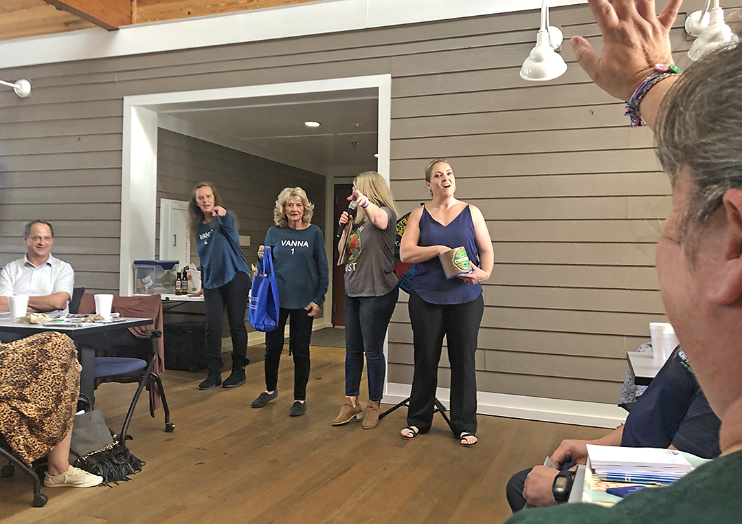 Ethel Jefferson and Zoe Mansfield of St. Marks, aka Vanna 1 and Vanna 2, with lunch MC Mary Wallace, who wore a T-shirt that said Game Show Host, with Audrey Frazier drawing cards for prizes at the luncheon.