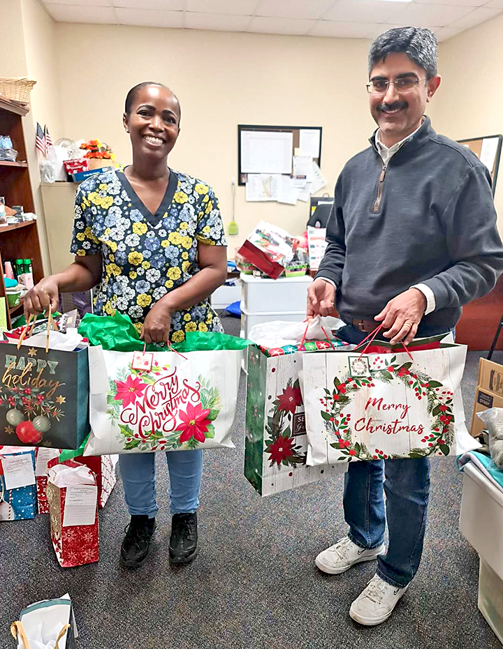 Hiron and Purvi Patel of Crawfordville Pharmacy provided Christmas gift bags for senior citizens at the senior center. Hiron Patel is seen delivering gift bags to the center’s activities director Felicia Hutchinson, whose office was reportedly packed with presents.