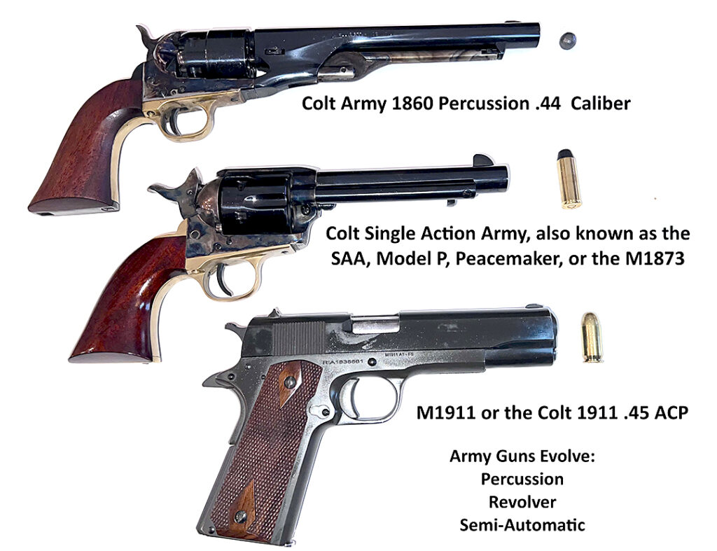 But no wonder these guns have been used by the military for so many years. From the 1860 Percussion Army, to the 1873 .45 Colt caliber Peacemaker, to the semi-automatic 1911 Colt in .45 ACP, handguns have evolved tremendously.
