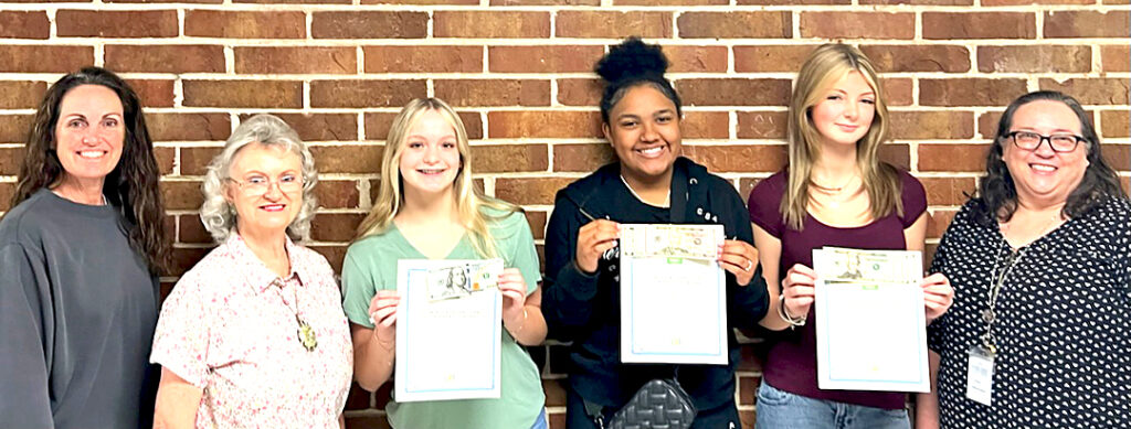WHS Principal Michele Falk, contest chair Nancy Floyd Richardson and Jo Ann Daniels congratulate the WHS first, second and third place winners, Tristen Hubbell, Ashlyn Haynes and Scarlette Brown.